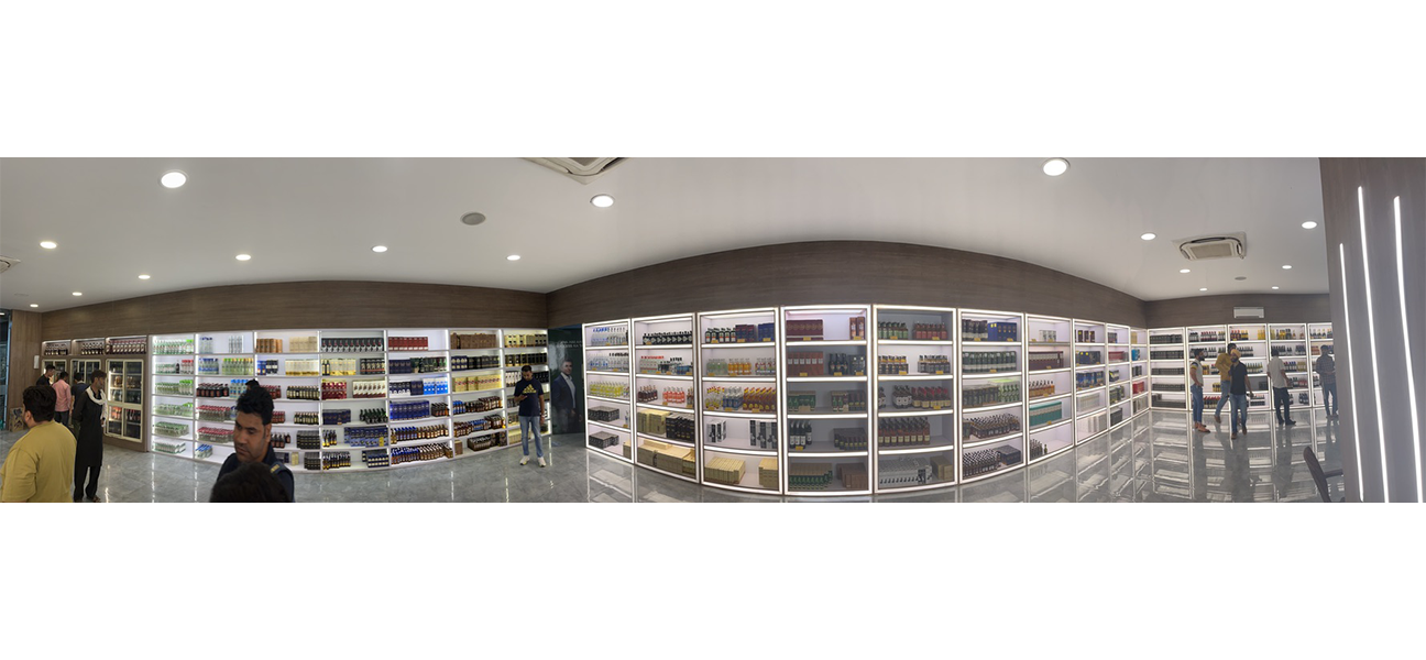 This shop is situated near to the Delhi border, though it legally falls within Bahadurgarh. The client already had racks and cassette air-conditioning units from a previously closed store, which were kept in stock. These existing racks were considered while developing the interior theme. The store was completely designed and executed with maximum reuse of available materials, including racks, cassette AC units, ducts, and AC machines.This approach helped control costs while maintaining a clean and functional retail environment.For any new luxury liquor store the electrical system must be upgraded to handle higher loads and ensure safety. A complete electrical rework was therefore carried out as operating the store without it would have compromised safety standards.