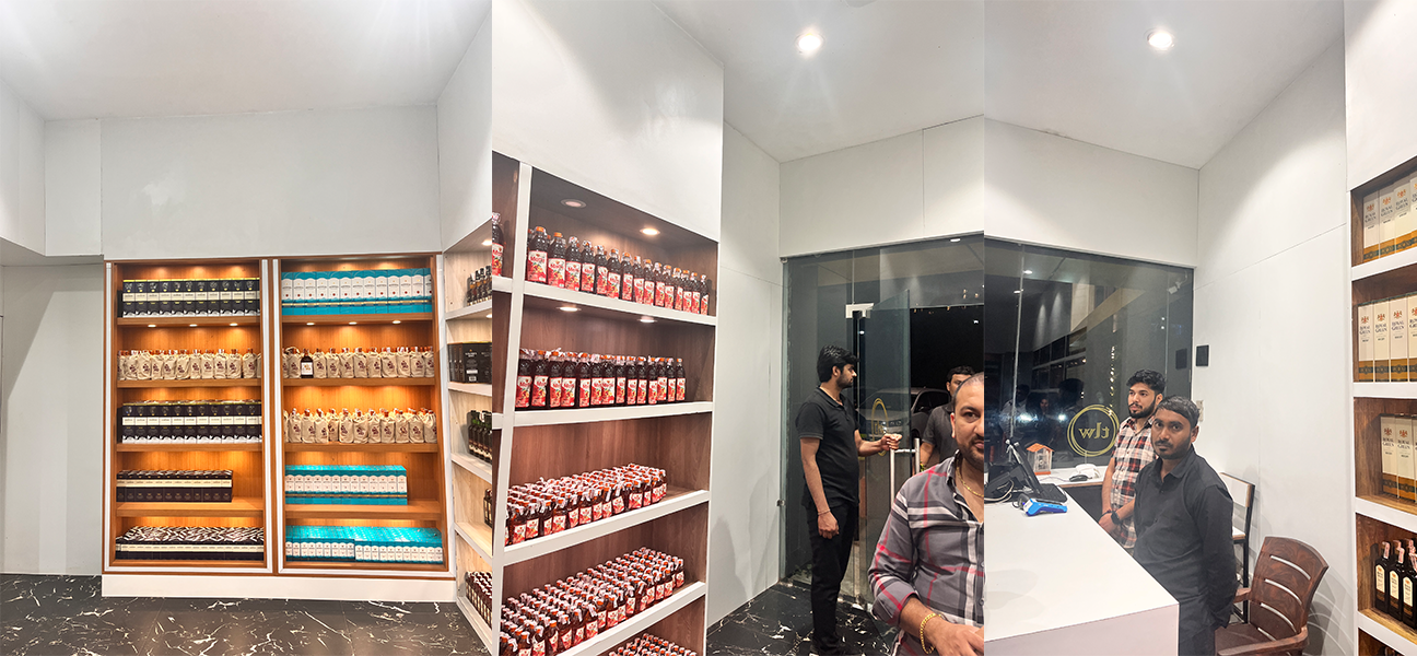 When the client took possession of the store from the previous owner the space was in poor condition. There were multiple issues such as water leakage from the ceiling uneven and insufficient branding areas partially damaged false ceilings non-functional air-conditioning and several steel columns positioned awkwardly in the middle of the space. The electrical system was also in bad shape restrooms were unhygienic and the biggest challenge was rainwater entering the store during monsoons. To reduce downtime we started working on multiple fronts simultaneously. Structural repairs, waterproofing services and interior corrections were planned in parallel to speed up execution. Once THE LIQUOR WAREHOUSE signage was installed it set the direction for the entire transformation. With the TLW branding in place every aspect of the store was redesigned and executed in line with the brand’s vision resulting in a clean functional and well-branded retail space.