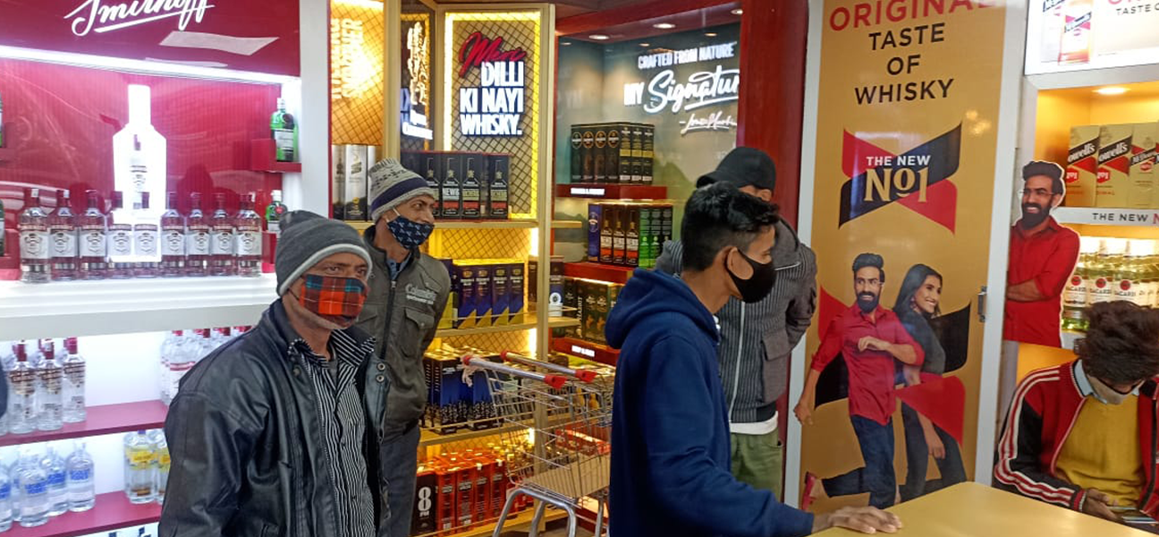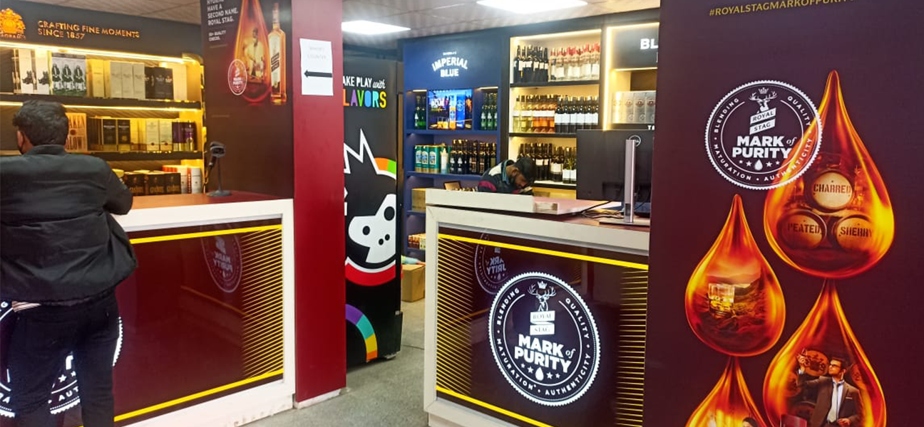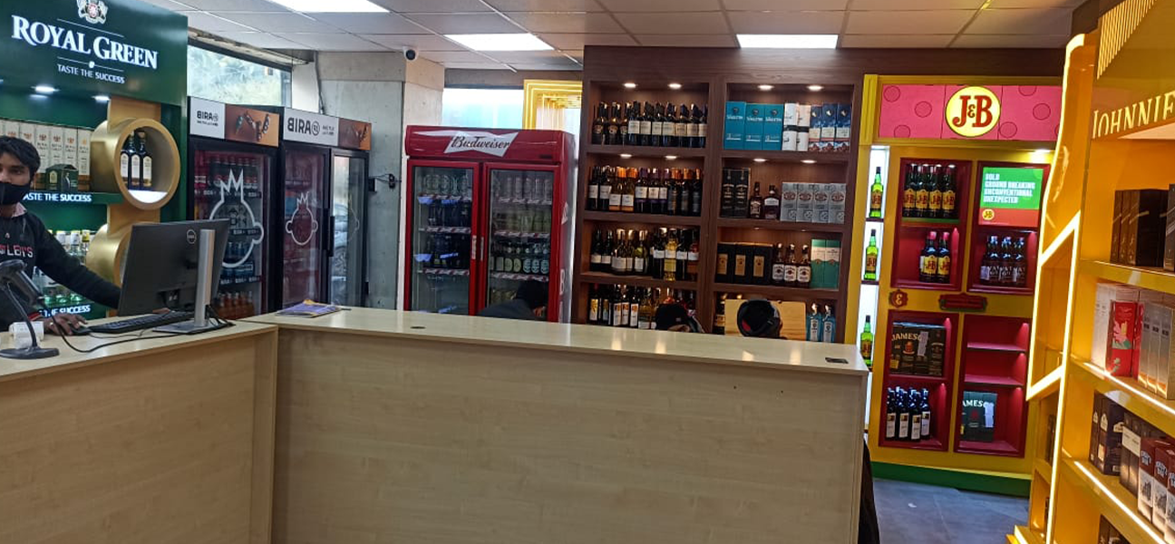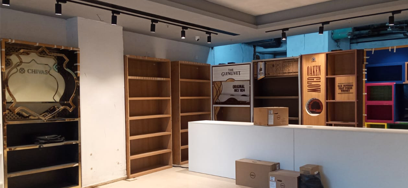 This outlet for the UNLIMITED SPIRITS brand had full branding rights assigned to Diageo. Diageo's team supplied and installed all racks and counters in accordance with this arrangement. Our scope of work on behalf of Trident Chemphar Ltd. covered the complete interior execution. This included civil work lighting flooring false ceilings the electrical system the front façade air-conditioning fire safety systems and signage. Due to the compact size of the space split air-conditioning units were selected to ensure efficient cooling without affecting layout or ceiling heights.