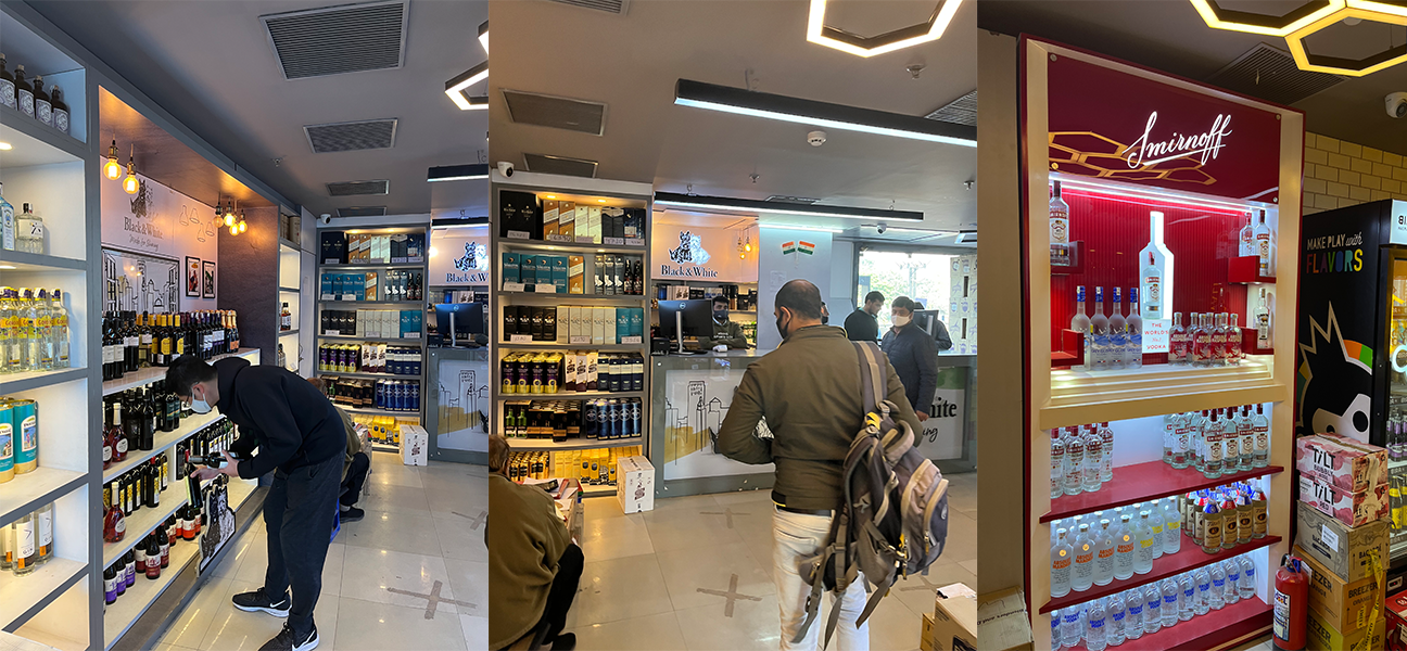 Diageo received full branding rights for this UNLIMITED SPIRITS brand outlet. Diageo's team supplied and installed all racks and counters in accordance with this arrangement. Our scope of work, on behalf of Trident Chemphar Ltd., covered the complete interior execution. This included civil work, lighting, flooring, false ceilings, the electrical system, the front façade, air-conditioning, fire safety systems, and signage. Due to the compact size of the space split air-conditioning units were selected to ensure efficient cooling without affecting layout or ceiling heights.