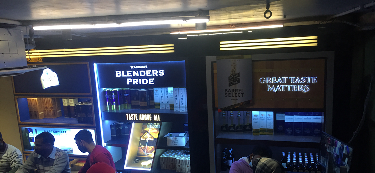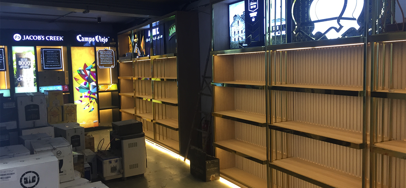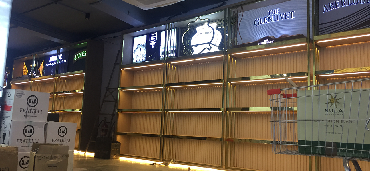 A premium retail space in the PVR Priya Complex in Vasant Vihar was introduse for a high-end liquor store. The site was spread across multiple levels, which required significant civil modifications to bring the base structure into proper shape before interior work could begin. Due to a tight project timeline most of the interior elements were prefabricated in our factory and later assembled on-site allowing us to maintain quality while saving execution time. Due to the need to connect the store to an adjoining first-floor shop, the project took longer than two months to complete. Both units were under different ownerships, which complicated coordination and approvals. Despite this, we successfully joined the spaces while keeping services—electrical, HVAC, and fire systems—independent for each shop. At the same time, we ensured that the overall look and experience remained seamless, presenting the two units as a single, premium retail destination.