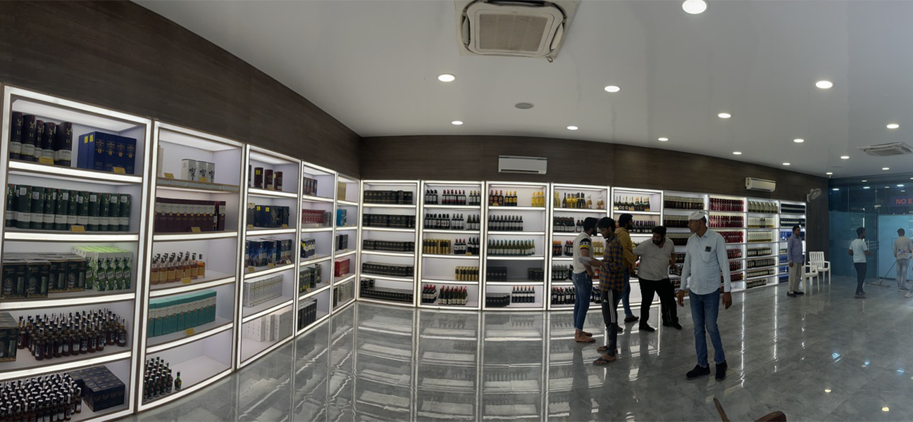 This shop is situated near to the Delhi border, though it legally falls within Bahadurgarh. The client already had racks and cassette air-conditioning units from a previously closed store, which were kept in stock. These existing racks were considered while developing the interior theme. The store was completely designed and executed with maximum reuse of available materials, including racks, cassette AC units, ducts, and AC machines.This approach helped control costs while maintaining a clean and functional retail environment.For any new luxury liquor store the electrical system must be upgraded to handle higher loads and ensure safety. A complete electrical rework was therefore carried out as operating the store without it would have compromised safety standards.