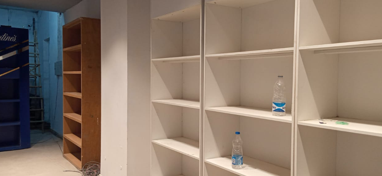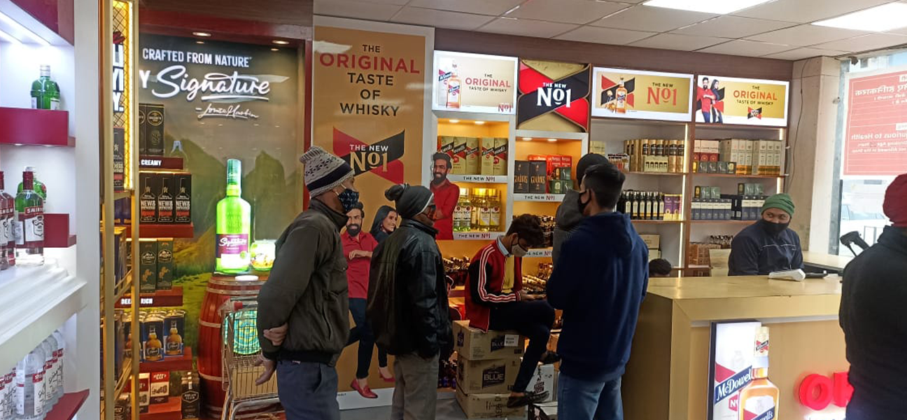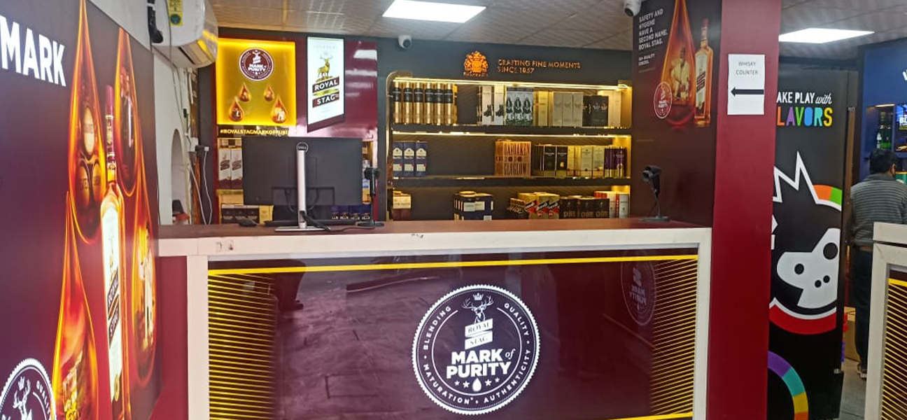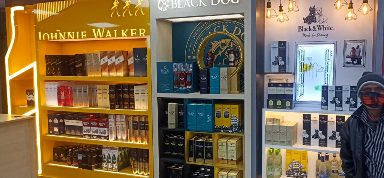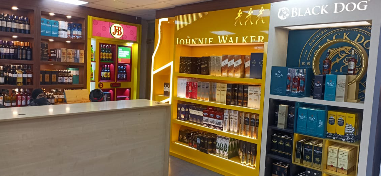 This outlet for the UNLIMITED SPIRITS brand had full branding rights assigned to Diageo. Diageo's team supplied and installed all racks and counters in accordance with this arrangement. Our scope of work on behalf of Trident Chemphar Ltd. covered the complete interior execution. This included civil work lighting flooring false ceilings the electrical system the front façade air-conditioning fire safety systems and signage. Due to the compact size of the space split air-conditioning units were selected to ensure efficient cooling without affecting layout or ceiling heights.