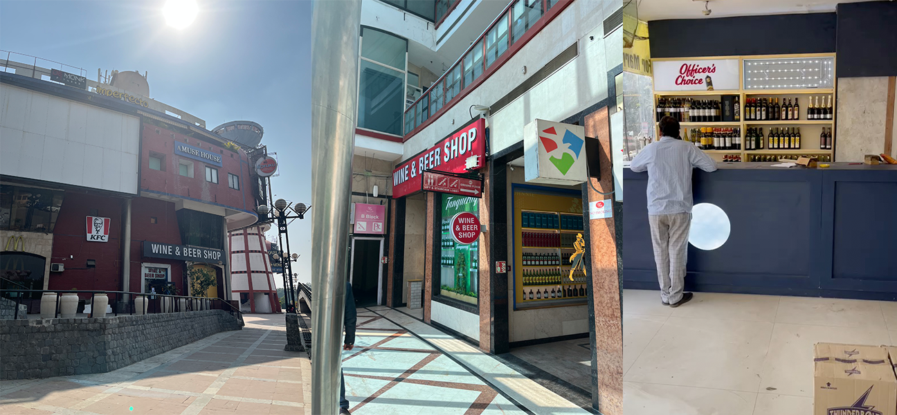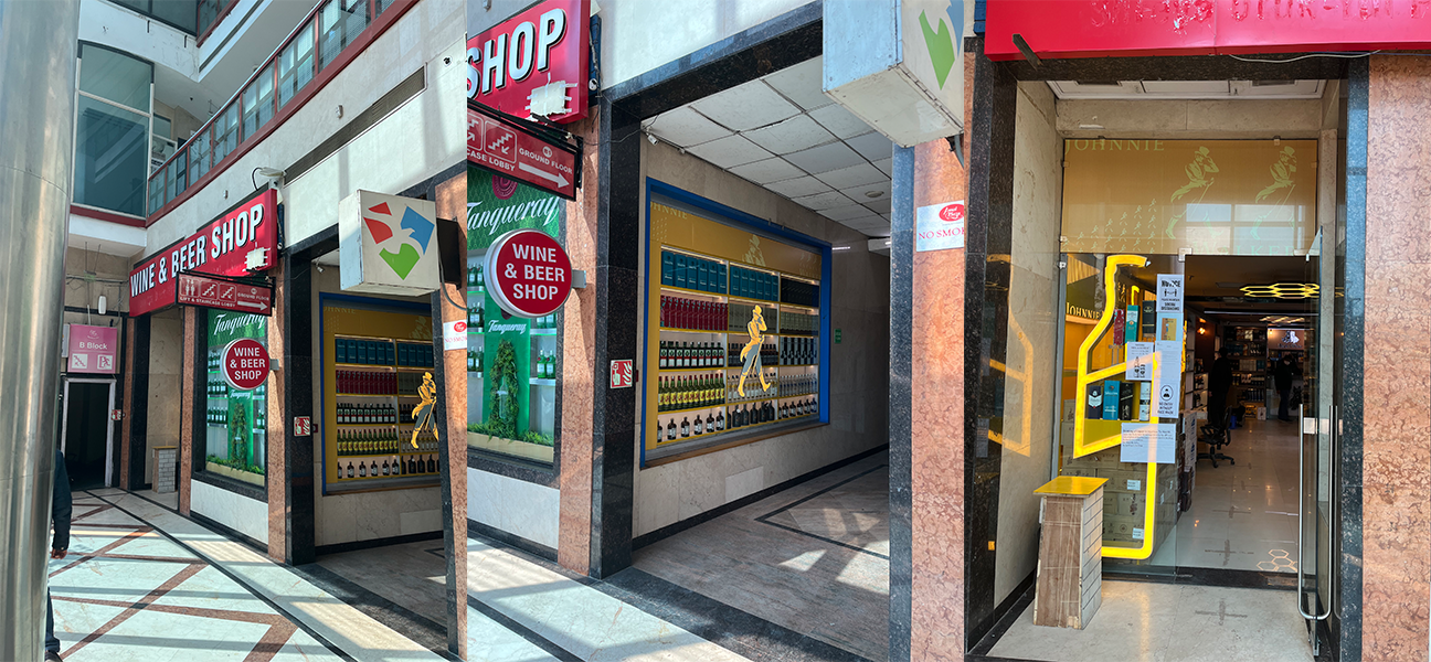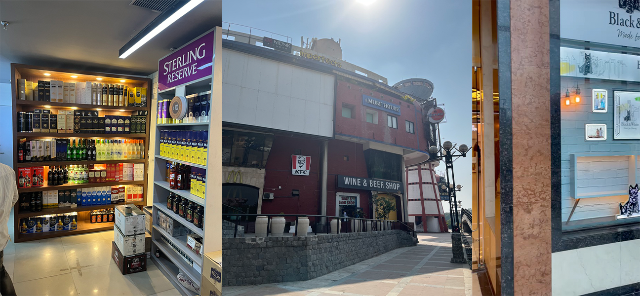 Diageo received full branding rights for this UNLIMITED SPIRITS brand outlet. Diageo's team supplied and installed all racks and counters in accordance with this arrangement. Our scope of work, on behalf of Trident Chemphar Ltd., covered the complete interior execution. This included civil work, lighting, flooring, false ceilings, the electrical system, the front façade, air-conditioning, fire safety systems, and signage. Due to the compact size of the space split air-conditioning units were selected to ensure efficient cooling without affecting layout or ceiling heights.